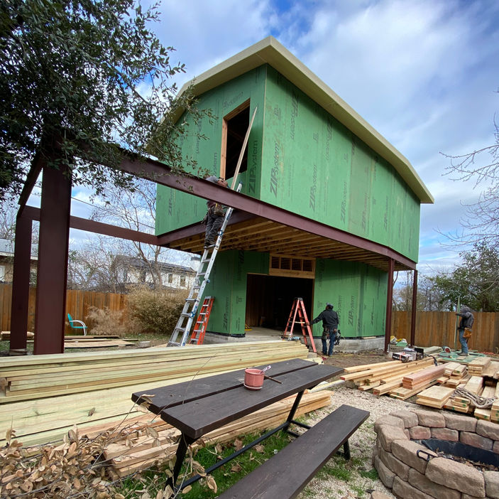Located just south of the river, in perfect distance of Zilker Park, South Lamar and downtown Austin, the clients wanted to create an ADU that can function both as an income-producing tourist rental and a flex-space for personal use. Designed in conjunction with their main house remodel (Phase 2. Coming Soon!), they wished to maintain an outdoor area that their family can enjoy. As a result, we created a cantilevered apartment with a separate access from the ground floor studio. This allows guests/renters to come and go as they please while the homeowners maintain privacy and can enjoy their backyard undisturbed.